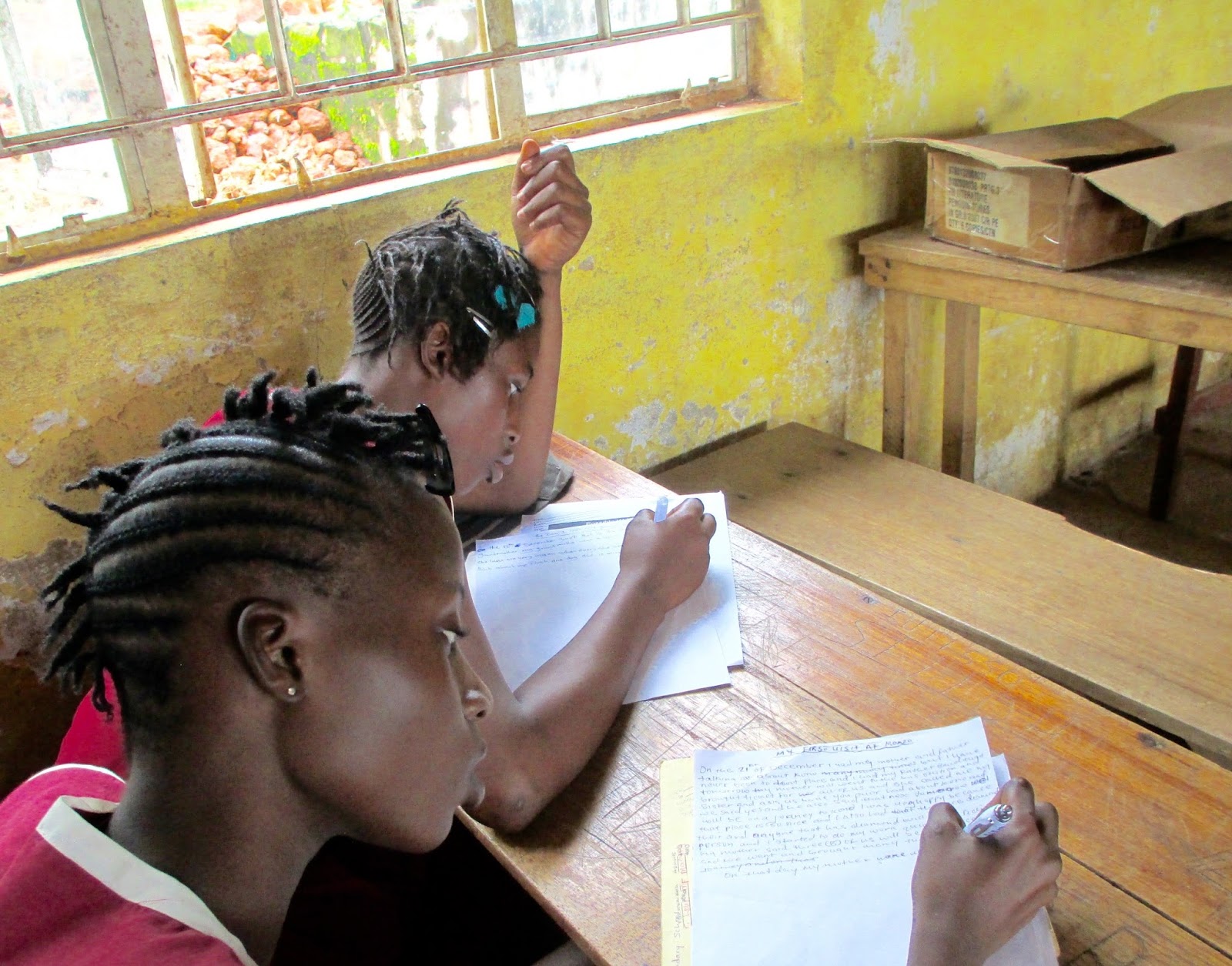 This term we began working with a new school, Abundant Grace, in Sussex. The club of junior secondary school students meets in the early childhood classroom because it has round tables where writers can easily spread out their multiple drafts, and meet in groups.During our visit today, one of the facilitators, Balla Kamara, was conferencing with a student while another student was working on revision.